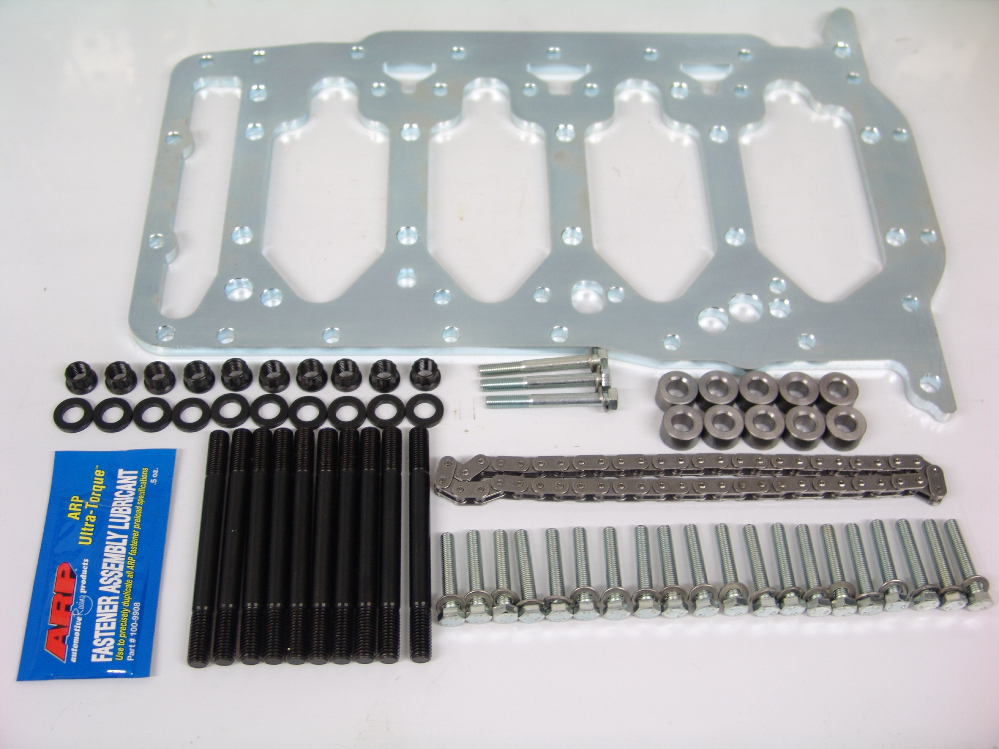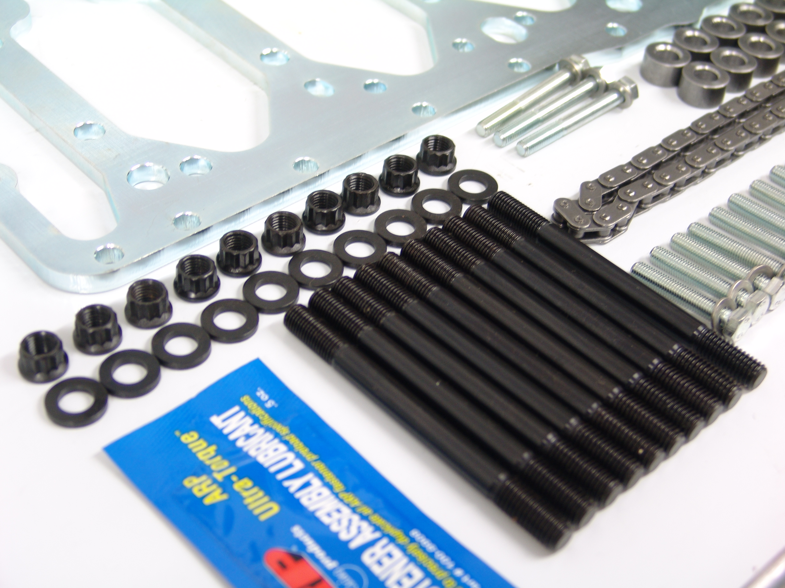 Inkl. 10 Distanzhülsen, 10 hochfesten 12.9 Schrauben (Serie 10.9), Schrauben mit U-Scheiben für die Ölpumpe, die Ölwanne und eine längere Ölpumpenkette.